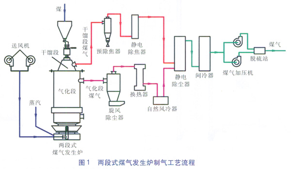 由于干餾段為煤的低溫干餾,因此干餾段煤氣含有未裂解的輕質焦油,需要采用除焦器去除干餾段煤氣中的焦油。氣化段煤氣往往含有炭黑、灰塵、水分,需要采用旋風除塵器等設備進行除塵[5],并利用換熱設備脫除氣化段煤氣中的水分。經處理后的干餾段煤氣、氣化段煤氣混合后經煤氣加壓機及脫硫后供給用戶。