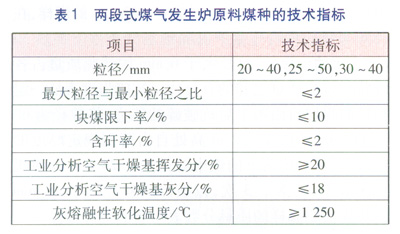 兩段式煤氣發生爐適宜氣化的煤種為不粘煤、弱粘煤、長焰煤等煙煤。雖然相對單段式煤氣發生爐而言,兩段式煤氣發生爐適用煤種范圍較寬,但是對原料煤的指標仍然要求比較嚴格。兩段式煤氣發生爐原料煤種的技術指標見表1。塊煤限下率:塊煤中小于規定粒徑下限部分的質量分數。熱穩定性指標TS+6:量取一定量粒徑為6~13mm的煤樣,在(850±15)℃的馬弗爐內隔絕空氣條件下加熱30min后稱量、篩分,粒徑大于6mm的殘焦質量占各級粒徑殘焦質量之和的百分比。抗碎強度表征一定粒徑的煤樣自由落下后抗破碎的能力:將粒徑為60~100mm的塊煤從2m高處自由落到規定厚度的鋼板上,然后將落下的煤中粒徑大于25mm的塊煤再次落下,共落下3次,以破碎后粒徑大于25mm的塊煤占原煤樣的質量分數表示煤的抗碎強度。